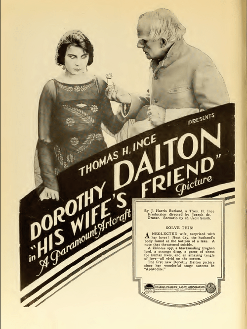 Ad for Dorothy Dalton in the film His Wife’s Friend (1919), directed by Joseph De Grasse.