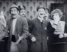 The woman Mabel had previously called ended up calling the police and the incompetent Keystone Cops were employed to solve the problem. When the policemen arrived, it looked like the neighbors saw that Mabel was in trouble and there were many people gathered on the porch, which created a huge confusion. The policemen went upstairs while the organ grinder was by the bedroom’s door, trying to enter. Mabel opened the door and guided one of the policemen to the window, as she thought that the burglar was there. In the middle of all this chaos Roscoe and the driver arrived back home. It turned out that the noise that came from the window was made by the monkey, who the organ grinder brought with him. Roscoe thought that all the chaos had happened because Mabel called the police without any reason and got angry with her at first, but after a while he managed to laugh at the situation.