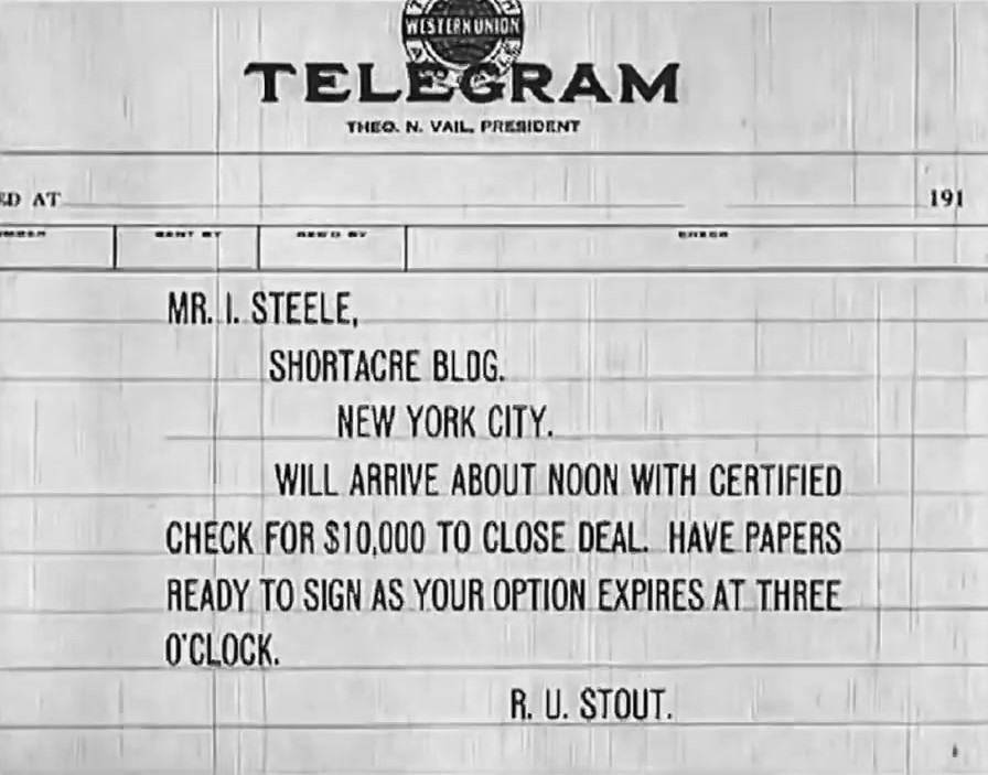 Right afterwards Fatty applied for a job as a janitor. As one of intertitles said, a broker, Mr. I. Steele, has a client who “will arrive about noon with certified check for $ 10.000 to close a deal” and the option expires at three o’clock. The broker left the office and requested a note to be delivered for his wife, letting her know about the upcoming business deal.
