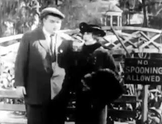 Fatty and Mabel sit down on the bench in a park and there was a sign besides the bench saying “No spooning allowed”. This can be an alert to the audience that it will not take long until a misunderstanding happen. Then the other couple arrive in the park and sits down on a similar bench, with a similar spooning sign. The husband starts smoking a cigar and there was lots of smoke, his wife stood up angrily and approached the bench where Fatty and Mabel were sitting down. After a while, she left and Fatty followed this other woman and started flirting with her.