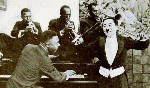 Actor Chai Hong and original members of the “Darktown Strutters,” from an unidentified L-Ko film, on page 1682 of the June 14, 1919 Moving Picture World.