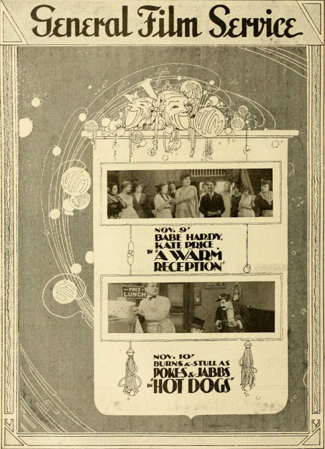 Advertisement in Moving Picture World for the American comedy short film A Warm Reception (1916).