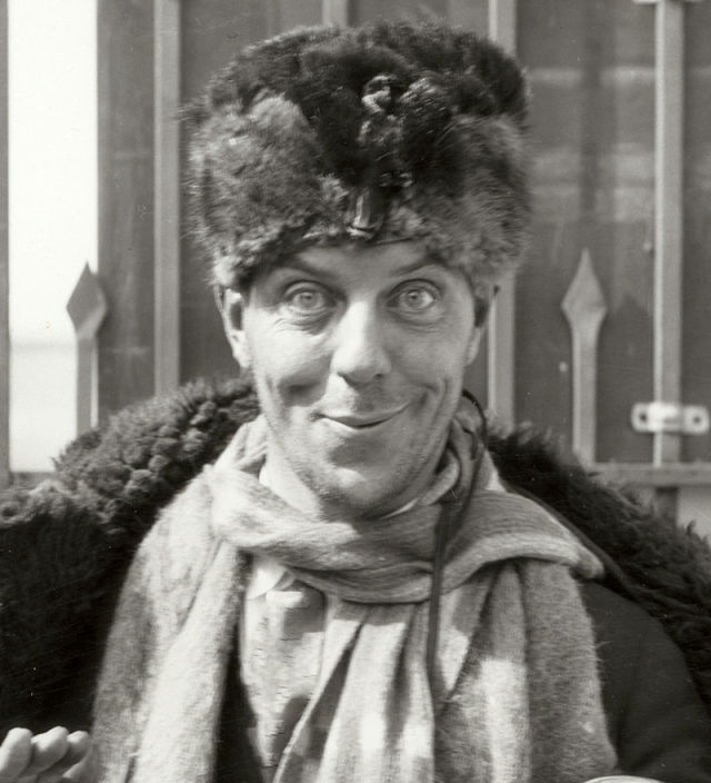 Karl Dane wearing and carrying a variety of clothes, including a fur hat, poses by the MGM studio gate in a 1927 publicity still.