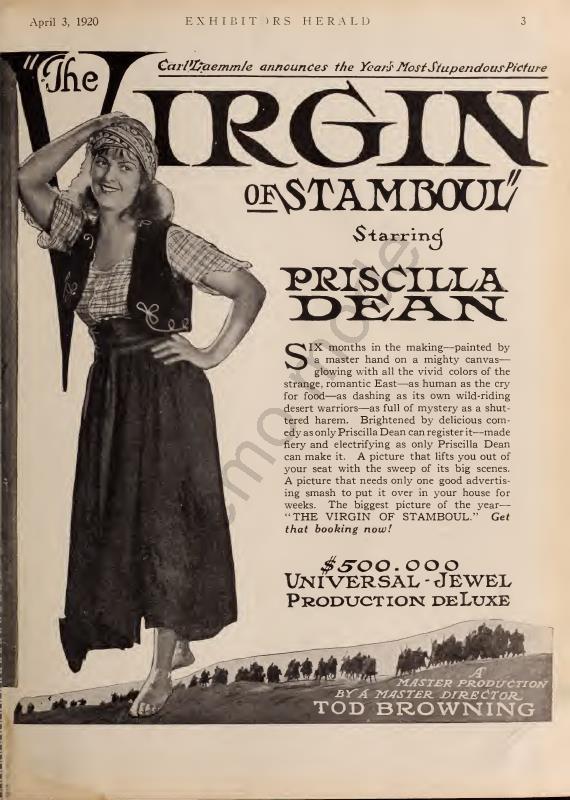 Advertisement in Exhibitors’ Herald, April 03rd 1920 of the American film The Virgin of Stamboul, starring Priscilla Dean.