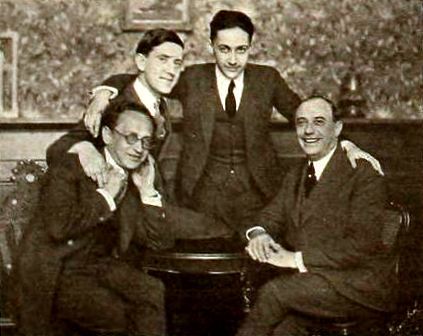 Universal Studios. New executives at Universal City: seated: Isadore Bernstein (left), producing manager; Sam Van Ronkle, assistant manager; standing: Louis Loeb, financial manager; and Irving Thalberg, west coast studio manager. On May 8th 1920 Motion Picture News, USA.