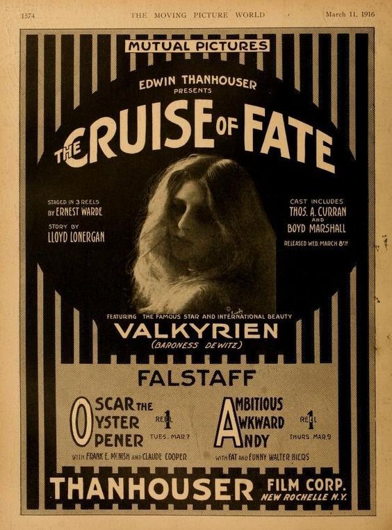 Advertisement in Moving Picture World on March 11, 1916. The Cruise of Fate (USA,1916). IMDB link: http://www.imdb.com/title/tt0385625/