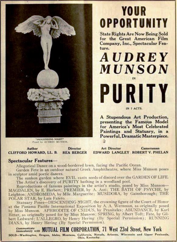 Ad for the American film Purity (1916) on page 1355 of the August 26, 1916 Moving Picture World. Instead of an image from the film, the ad uses a photograph of the statue “Descending Night” (by Adolph Alexander Weinman) for which actress Audrey Munson had posed.