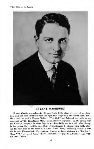 Bryant Washburn (born Franklin Bryant Washburn; April 28, 1889 – April 30, 1963) was an American film actor. Wikipedia link: https://en.wikipedia.org/wiki/Bryant_Washburn