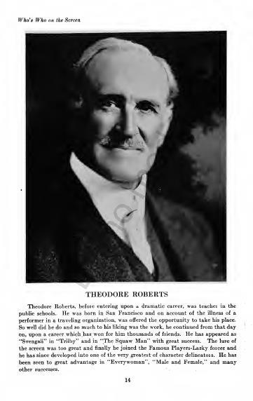 Theodore Roberts (October 8, 1861, San Francisco, California – December 14, 1928, Hollywood, California) was an American film and stage actor. On stage in the 1890s he acted with Fanny Davenport in her play called Gismonda (1894) and later in The Bird of Paradise (1912) with actress Laurette Taylor. He started his film career in the 1910s in Hollywood, and was often associated in the productions of Cecil B. DeMille. Wikipedia link: https://en.wikipedia.org/wiki/Theodore_Roberts
