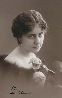 Ebba Thomsen (3 May 1887–18 December 1973) was a Danish actress during the golden era of silent films in Denmark. Thomsen was best known for her roles as the elegant leading lady opposite the Danish matinee idol Valdemar Psilander. Wikipedia link: https://en.wikipedia.org/wiki/Ebba_Thomsen