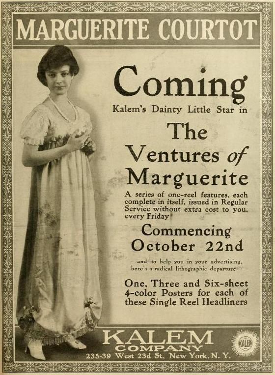Marguerite Gabrielle Courtot (August 20, 1897 – May 28, 1986) was an American silent film actress. Wikipedia link: https://en.wikipedia.org/wiki/Marguerite_Courtot