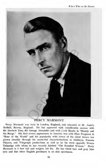 Percy Marmont (25 November 1883 – 3 March 1977) was an English film actor. He appeared in more than 80 films between 1916 and 1968. Wikipedia link: https://en.wikipedia.org/wiki/Percy_Marmont
