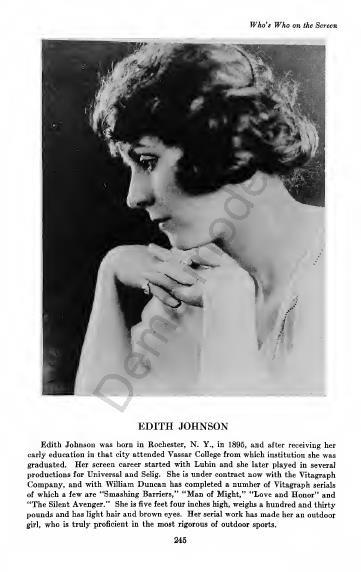 Edith Johnson (August 10, 1894 – September 6, 1969) was an American actress of the silent era. She appeared in 66 films between 1913 and 1924. Wikipedia link: https://en.wikipedia.org/wiki/Edith_Johnson