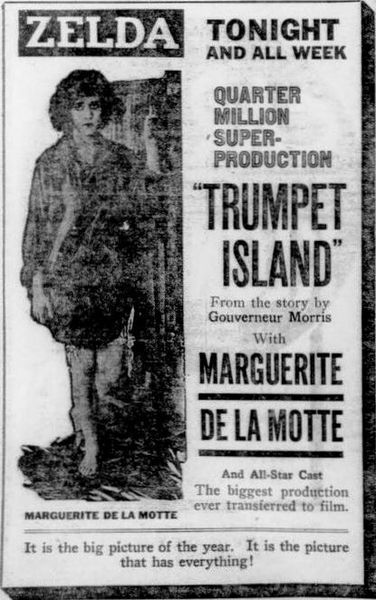 Newspaper ad for the American film Trumpet Island (1920) with Marguerite De La Motte, on page 10 of the January 1, 1921 Duluth Herald.