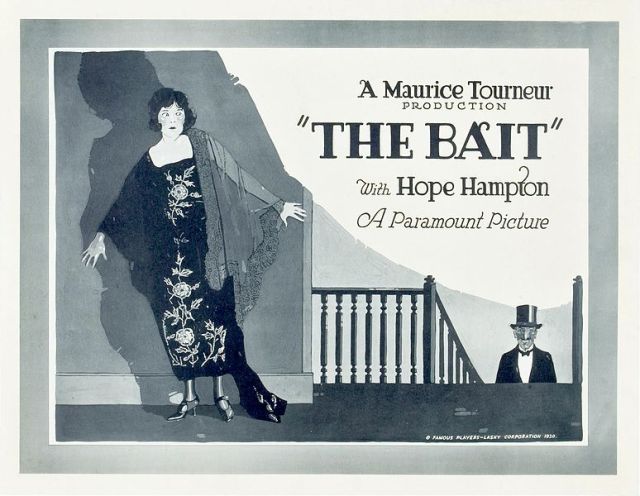 The Bait was a 1921 American silent crime drama film produced by and starring Hope Hampton, directed by Maurice Tourneur and distributed by Paramount Pictures. This is a contemporary lobby card for the film.