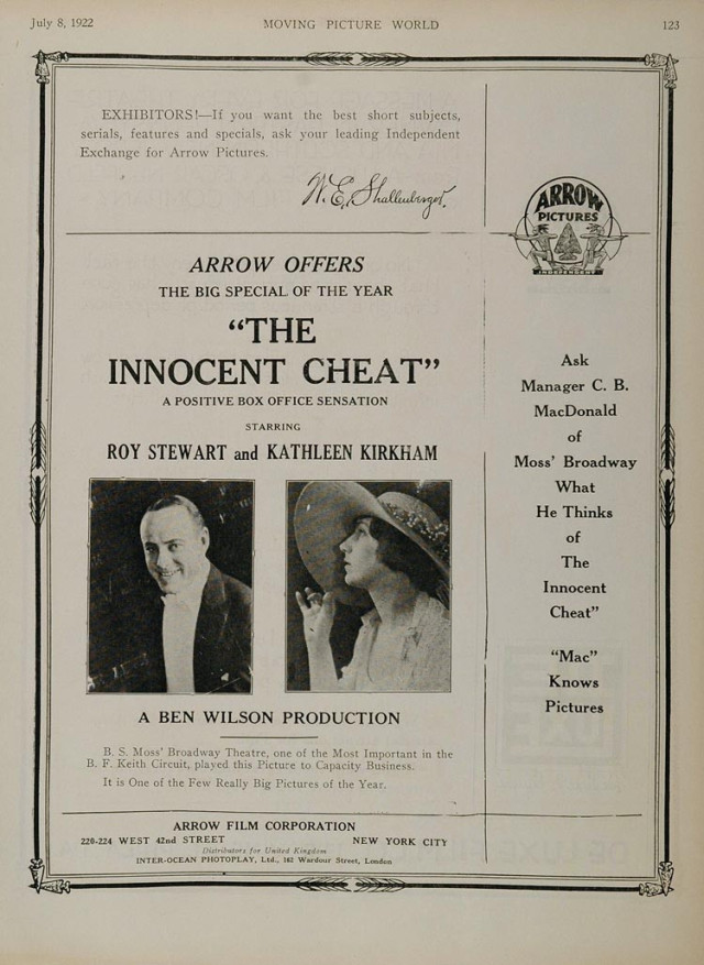 Advertisement, Silent Film, Arrow Pictures, The Innocent Cheat at the magazine Moving Picture World, July 8th 1922.