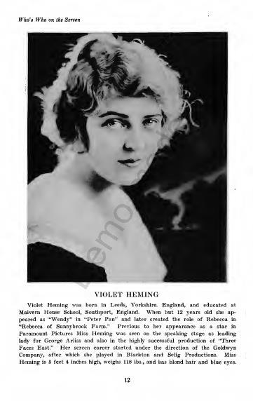 Violet Heming (January 27, 1895 – July 4, 1981) was an English stage and screen actress. Wikipedia link: https://en.wikipedia.org/wiki/Violet_Heming