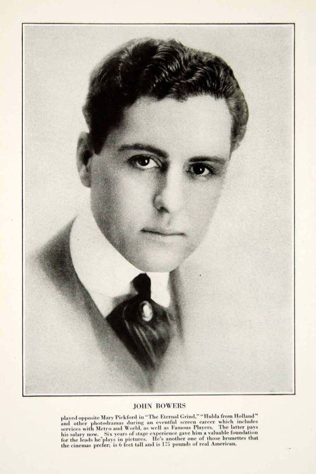 John Bowers (December 25, 1885 – November 17, 1936) was an American stage and silent film actor who starred in ninety-four films including short subjects. Wikipedia link: https://en.wikipedia.org/wiki/John_Bowers_%28actor%29