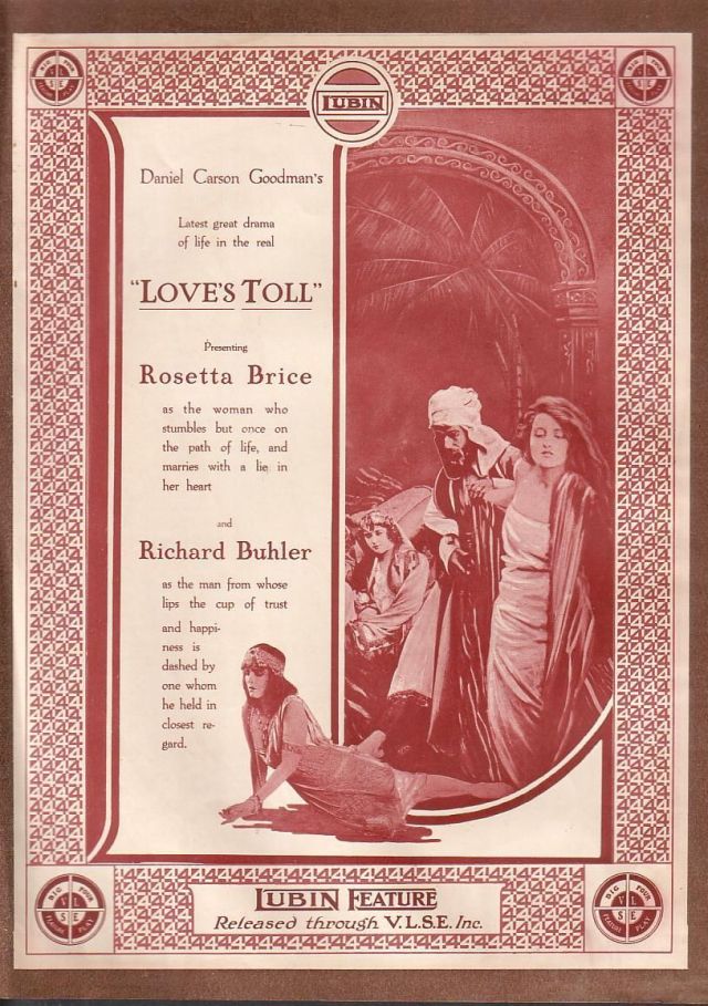 Rosetta Brice, Richard Buhler, 1916 Ad- Love’s Toll, Lubin, Daniel Carson Goodman.