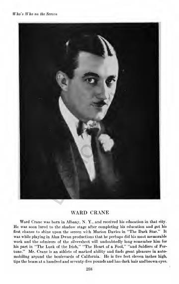 Ward Crane (May 18, 1890 – July 21, 1928) was a silent film actor popular in comedies and dramas. Out of dozens of films, he is remembered as the handsome heavy to Buster Keaton’s hero in Sherlock, Jr. (1924). Crane died at age 38 in Saranac Lake from pneumonia. Wikipedia link: https://en.wikipedia.org/wiki/Ward_Crane