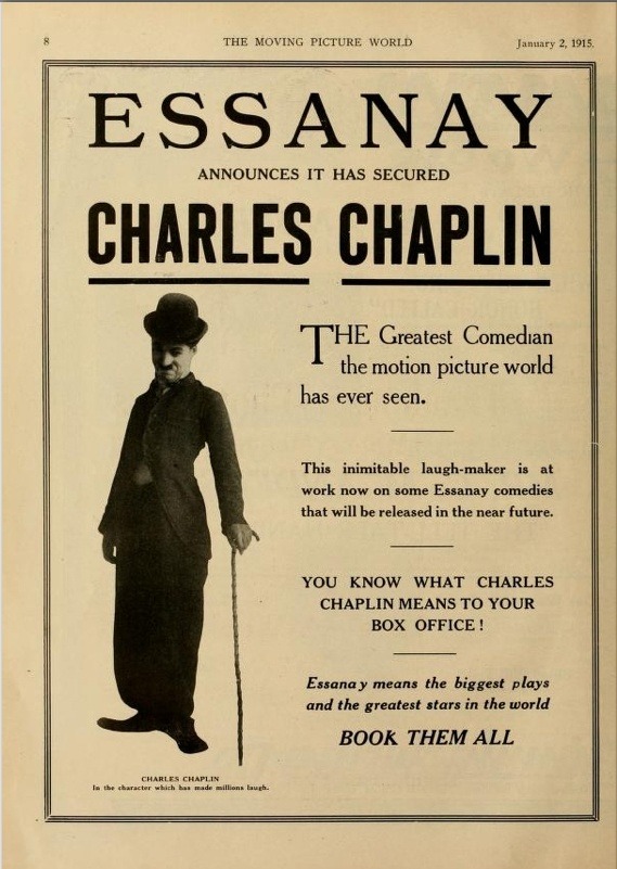 An ad in the magazine The Moving Picture World, January 02nd 1915, page 08, USA. Essanay announces it has secured Charles Chaplin.