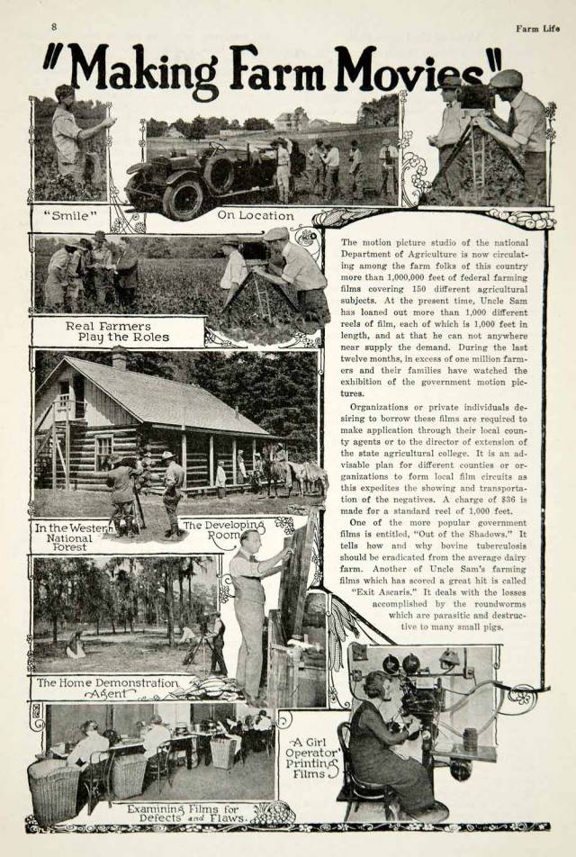 This is an original 1922 one-page black and white print article “Making Farm Movies” about the motion picture program of the U. S. Department of Agriculture. This Department has produced more than one million feet of educational farming films covering 150 different agricultural subjects. Two of the films mentioned in the article are “Out of the Shadows” about bovine tuberculosis and “Exit Ascaris” about roundworms in pigs.