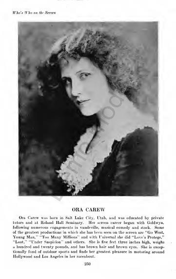 Ora Carew (April 19, 1891 – October 26, 1955) – born Ora Whytock- was a silent film actress. Wikipedia link: https://en.wikipedia.org/wiki/Ora_Carew