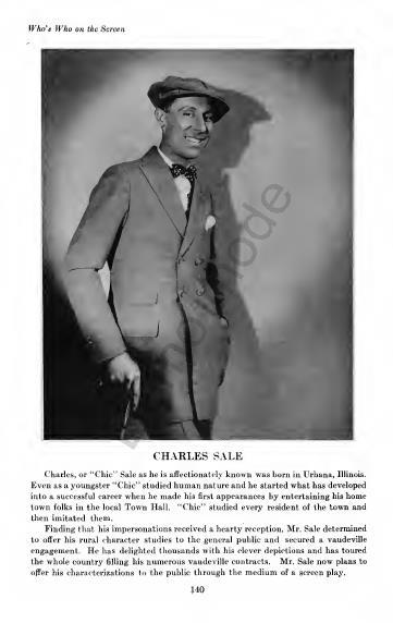 Charles Partlow “Chic” Sale (August 25, 1885, Huron, South Dakota – November 7, 1936, Los Angeles, California) was an American actor and vaudevillian. Wikipedia link: https://en.wikipedia.org/wiki/Charles_%22Chic%22_Sale