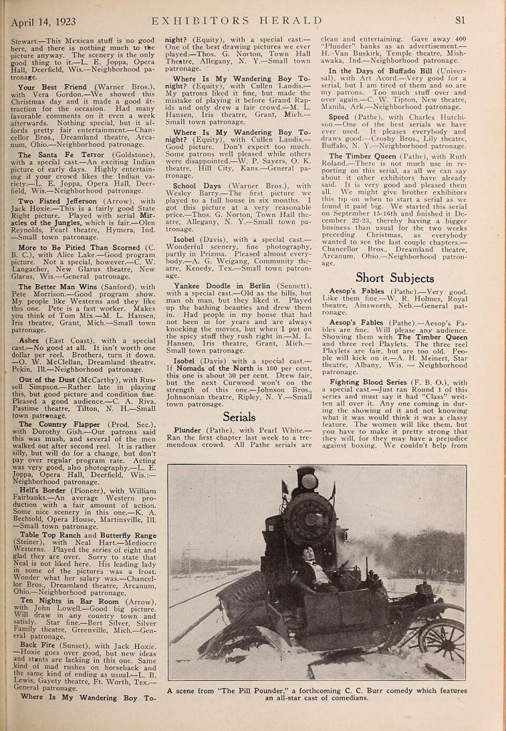 This full page features an image of Charles Murray in “The Pill Pounder” which has an early Clara Bow role. The short comedy was a two reeler.