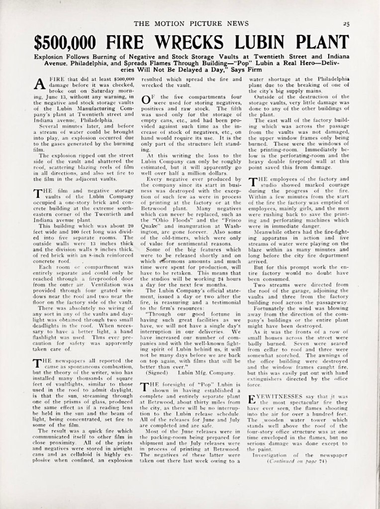 Screenshot of news article titled “$500,000 Fire Wrecks Lubin Plant” published in The Motion Picture News (New York, N.Y.), 27 June 1914, p. 25 (continued in same issue on p. 74.); coverage of disastrous vault fire on 13 June 1914 at “Lubinville” plant in North Philadelphia, Pennsylvania; screenshot of article captured and cropped for page formatting by Wikipedia contributor Strudjum on 3 October 2021.