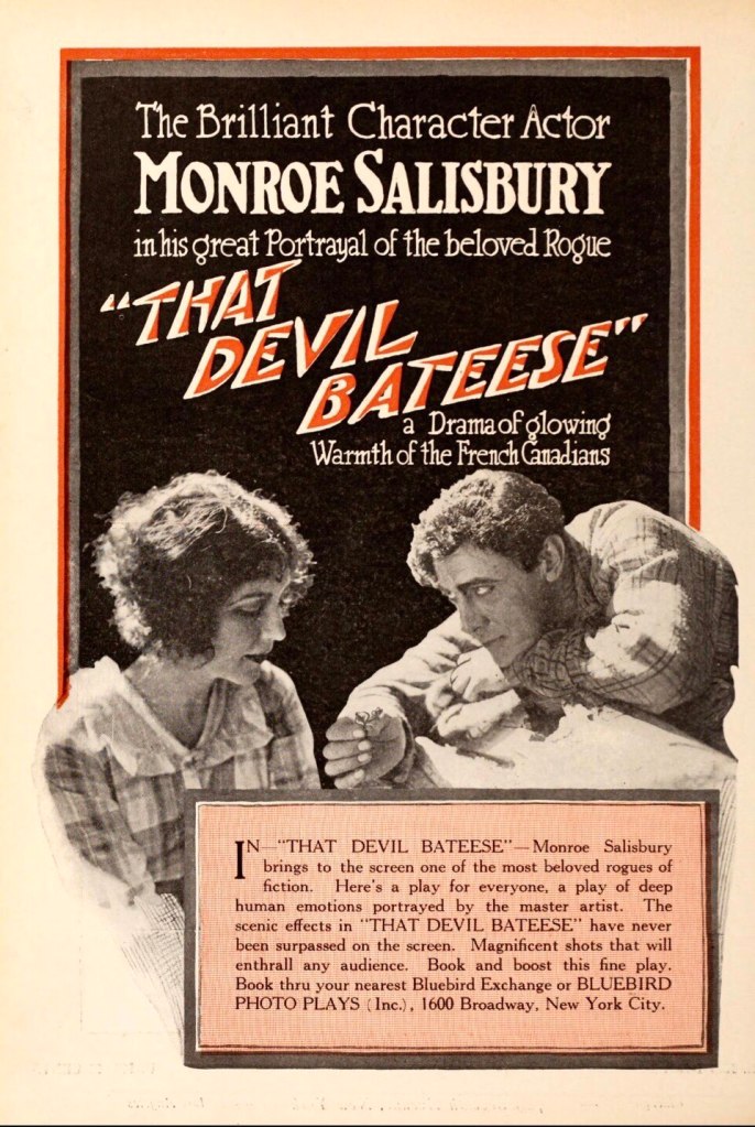 Screenshot of full-page advertisement for the film That Devil, Bateese starring Monroe Salisbury, published in the trade magazine Motion Picture News (New York, N.Y.: Motion Pictures News, Inc.), volume XVIII, number 9, August 31, 1918, printed on reverse of front cover; heading on advertisement reads, “The Brilliant Character Actor Monroe Salisbury in his great Portrayal of the beloved Rogue”; also pictured in the advertisement is Salisbury’s love interest in the film, actress Ada Gleason; image captured and cropped for page formatting by Wikipedia contributor Strudjum on April 12, 2023.